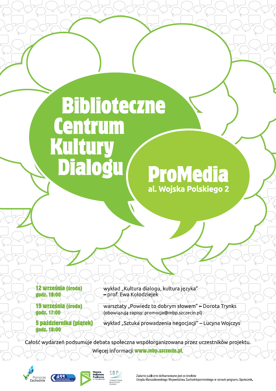 Projekt „Centrum Kultury Dialogu” organizowany jest przez Stowarzyszenie Bibliotekarzy Polskich – Zarząd Oddziału w Szczecinie oraz Koło nr 3 przy Miejskiej Bibliotece Publicznej w Szczecinie. Zadanie publiczne dofinansowane jest ze środków Urzędu Marszałkowskiego Województwa Zachodniopomorskiego w ramach programu Społecznik.